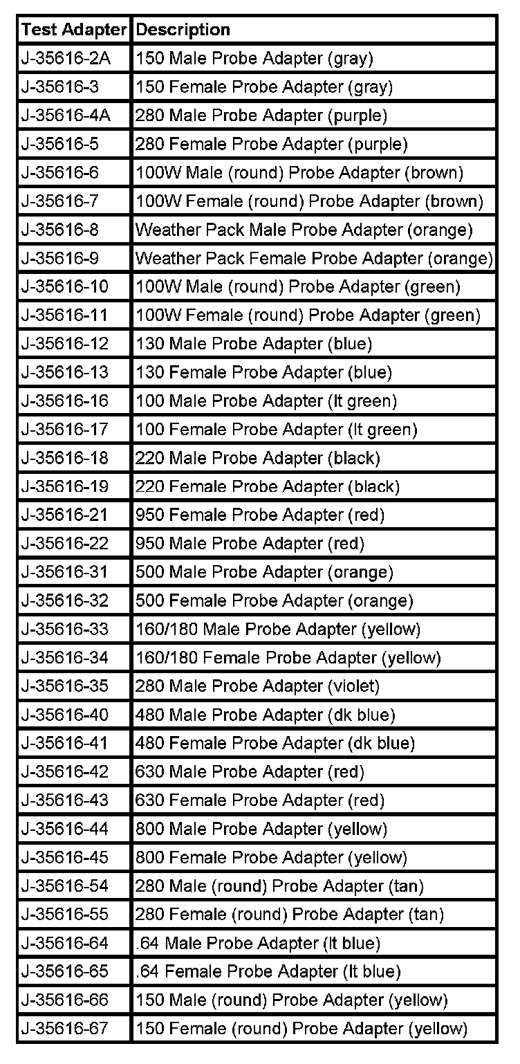 NOTE: Do not insert test equipment probes (DVOM etc.) into any connector or fuse block terminal. The diameter of the test probes will deform most terminals. A deformed terminal will cause a poor connection, which will result in a system failure. Always use the J-35616 GM-Approved Terminal Test Kit or the J 42675 Flat-Wire Probe Adapter in order to front probe terminals. Do not use paper clips or other substitutes to probe terminals.