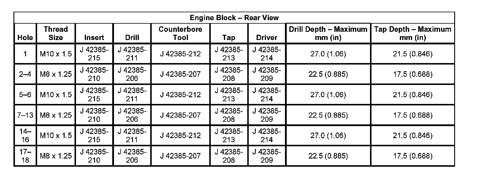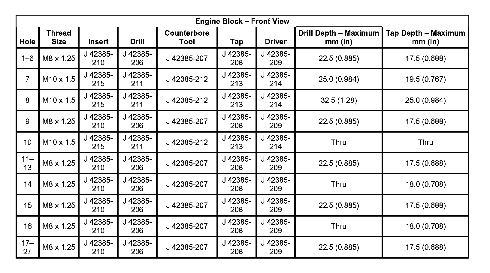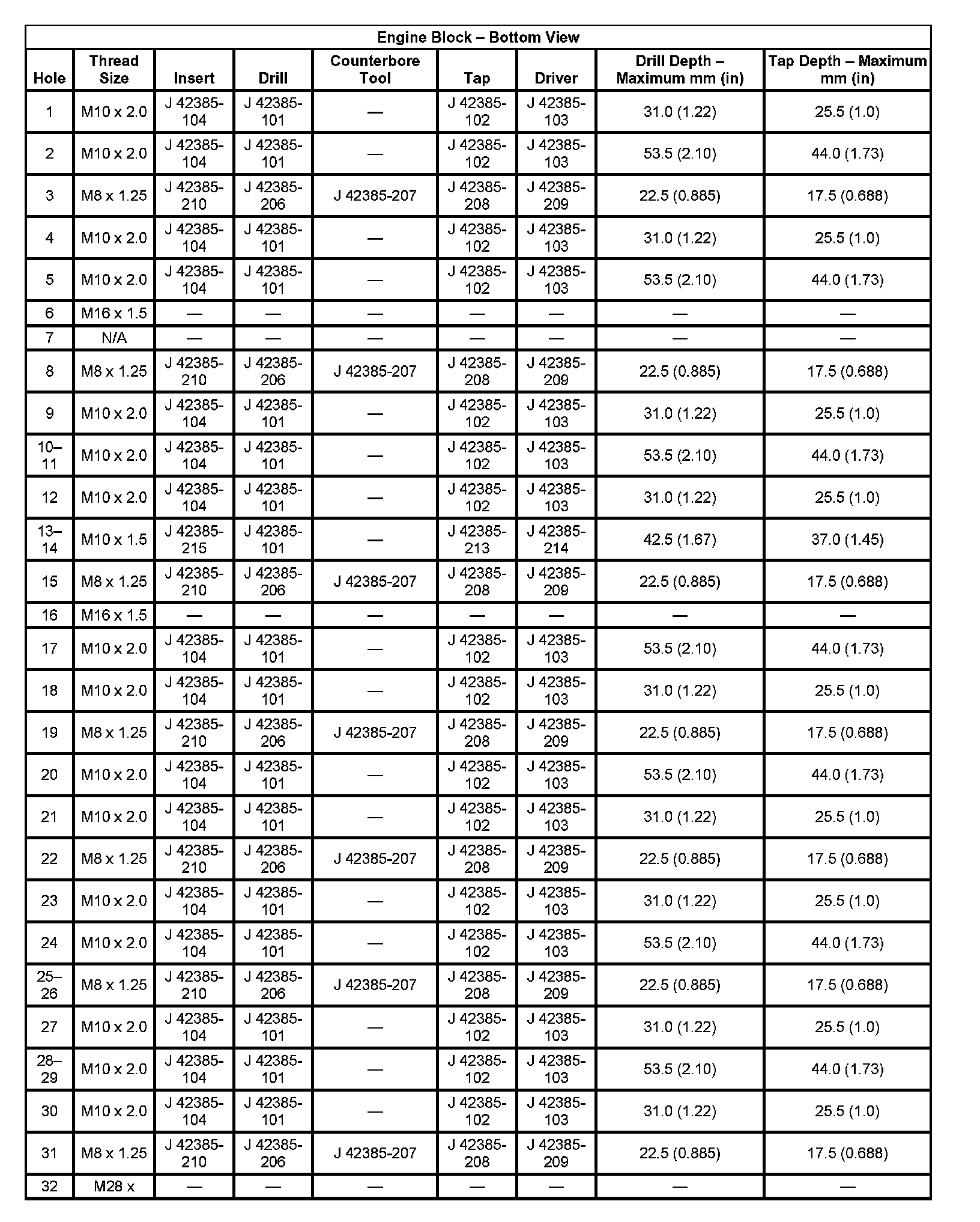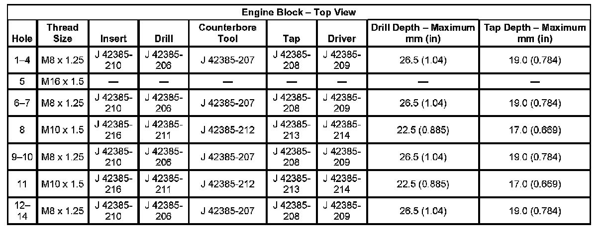 Thread Repair Specifications Engine Block: