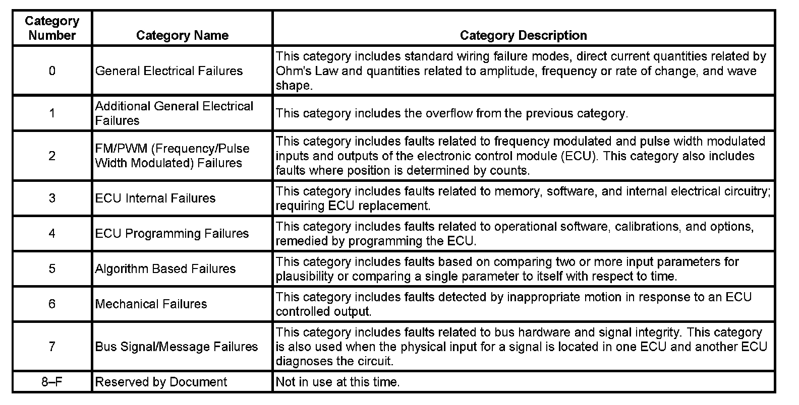 The DTC symptom is made up of 2 alphanumeric digits. The first digit following the DTC indicates the DTC symptom category. There are 16 possible categories available in the range of 0 through the letter F. Currently there are 8 categories in use, 0 through 7. These 8 categories together with their definitions are given.