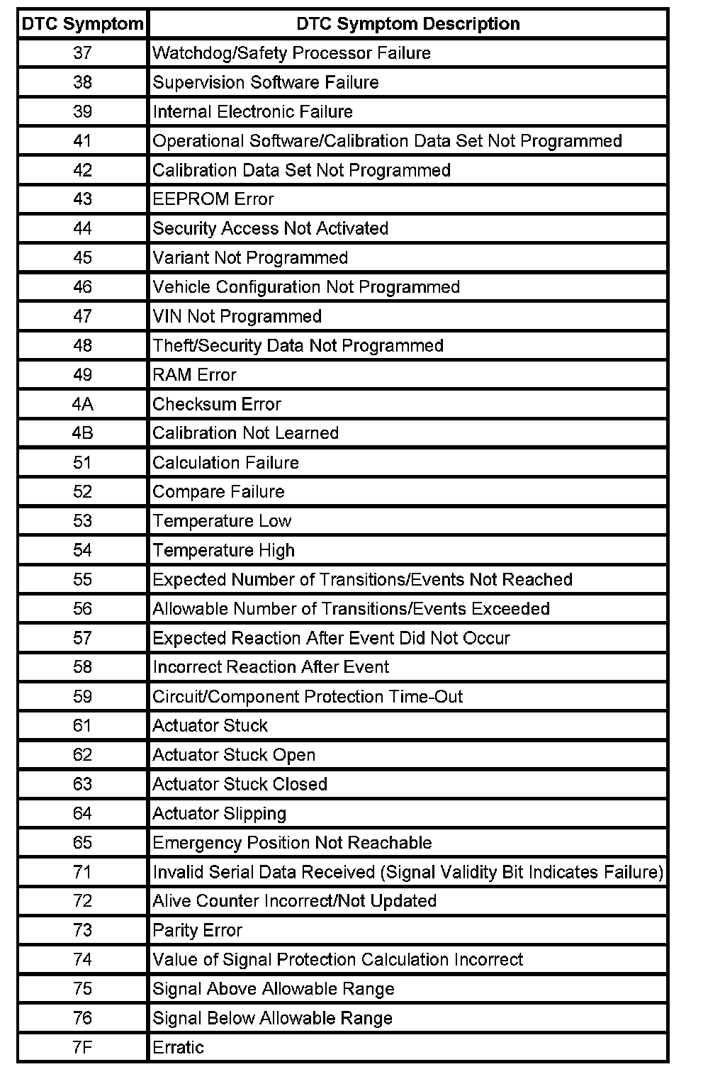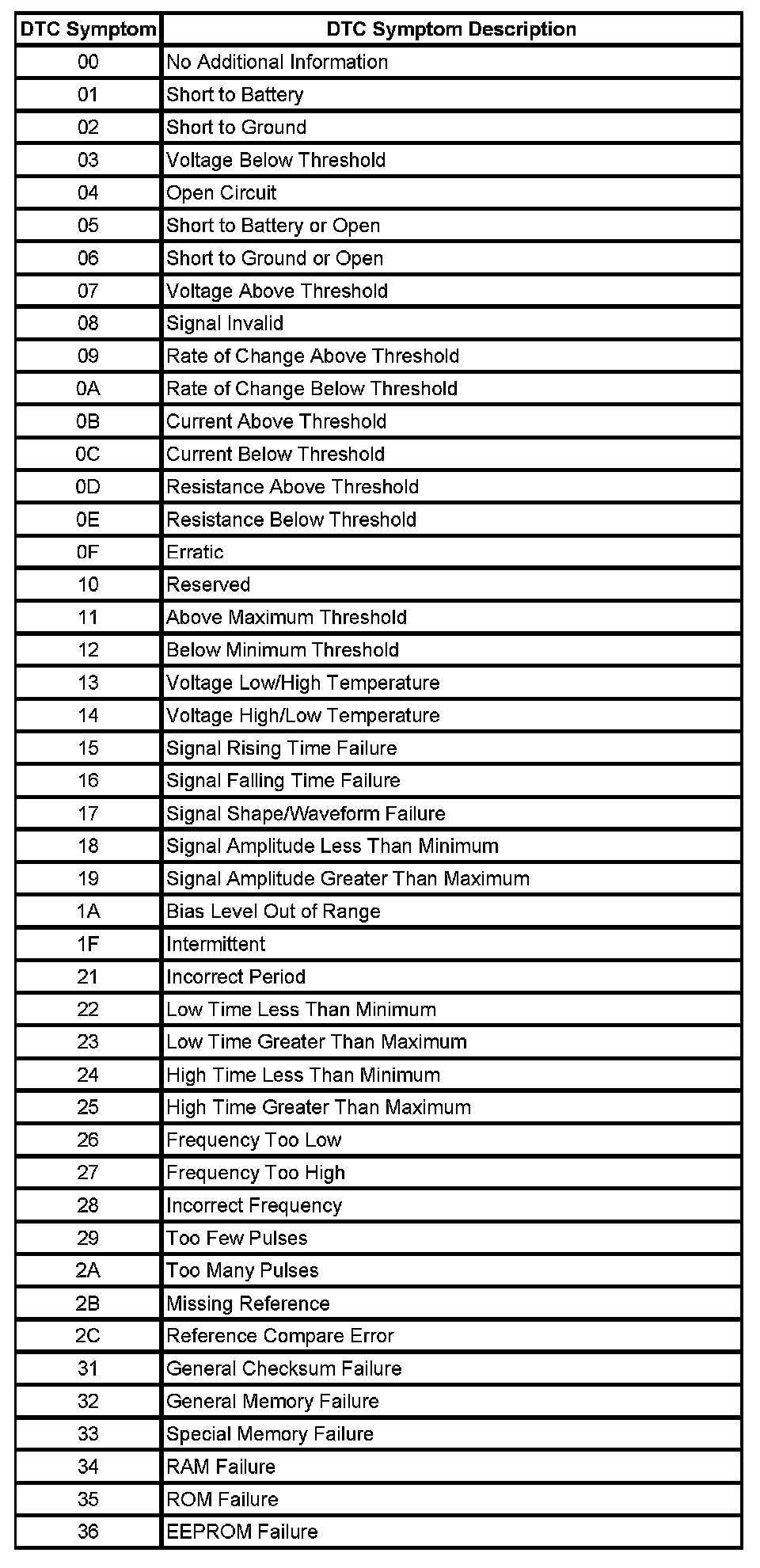 A DTC symptom is a 2-digit number which adds additional detail to a DTC. The DTC symptom provides additional information without requiring a large increase in the number of new DTCs.