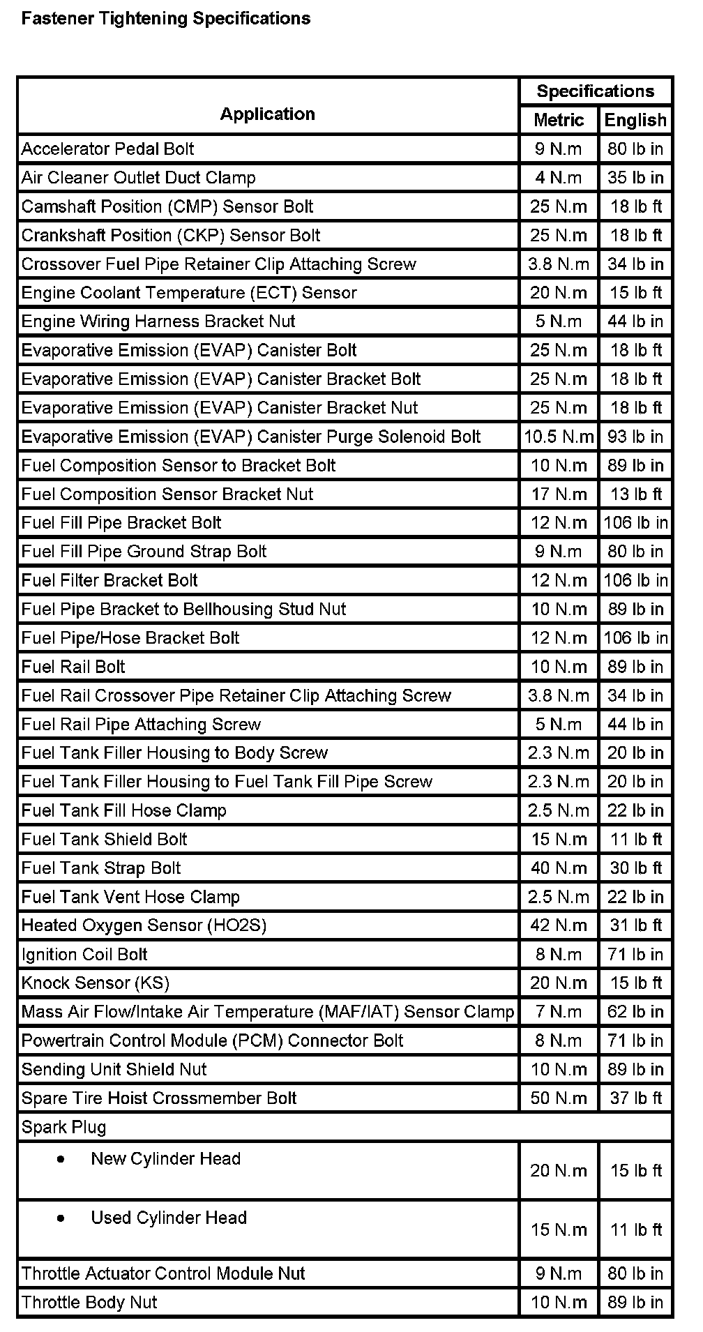 Fastener Tightening Specifications:
