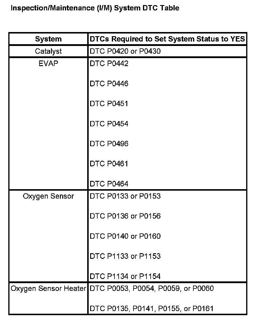 Inspection/Maintenance (I/M) System DTC Table: