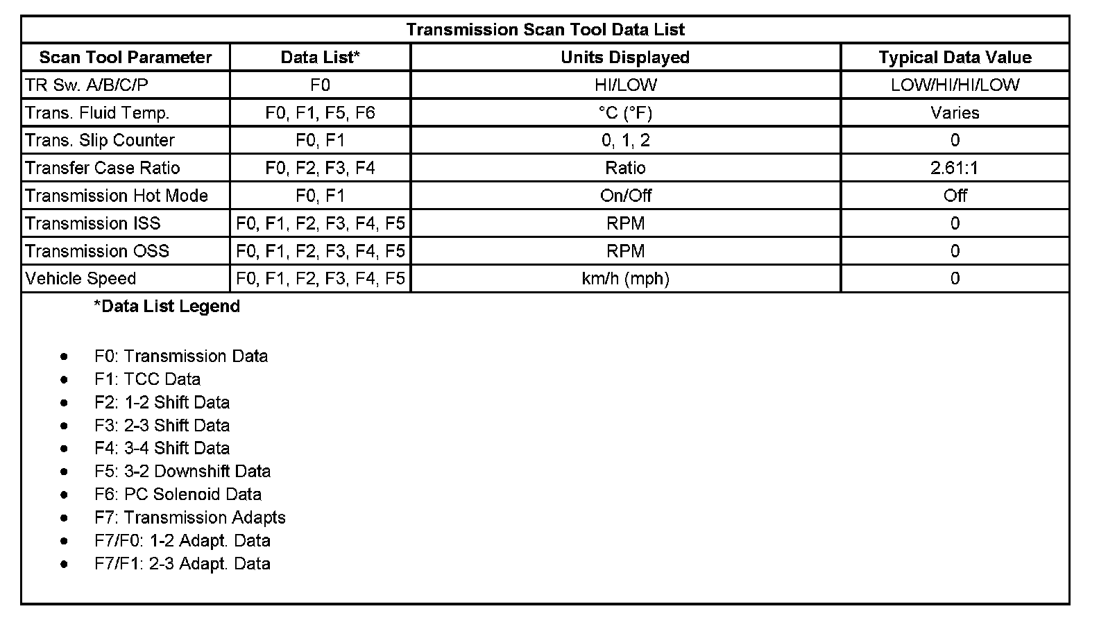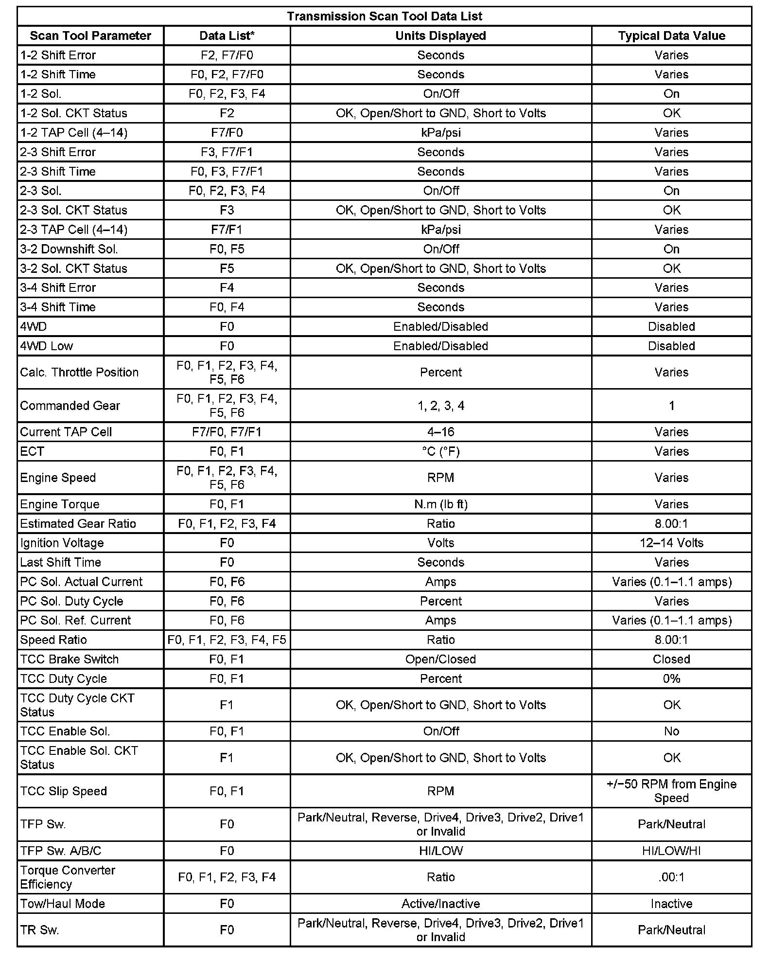 Only the parameters listed below are used in this manual for diagnosing. If a scan tool displays other parameters, the values are not recommended by General Motors for use in diagnosis.