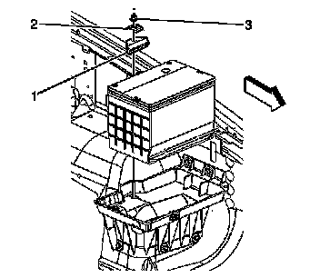 2. Install the battery hold down retainer (1), nut (3), and washer.