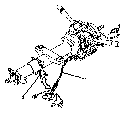 4. Remove the wiring harness (1) from the steering column harness strap (2).