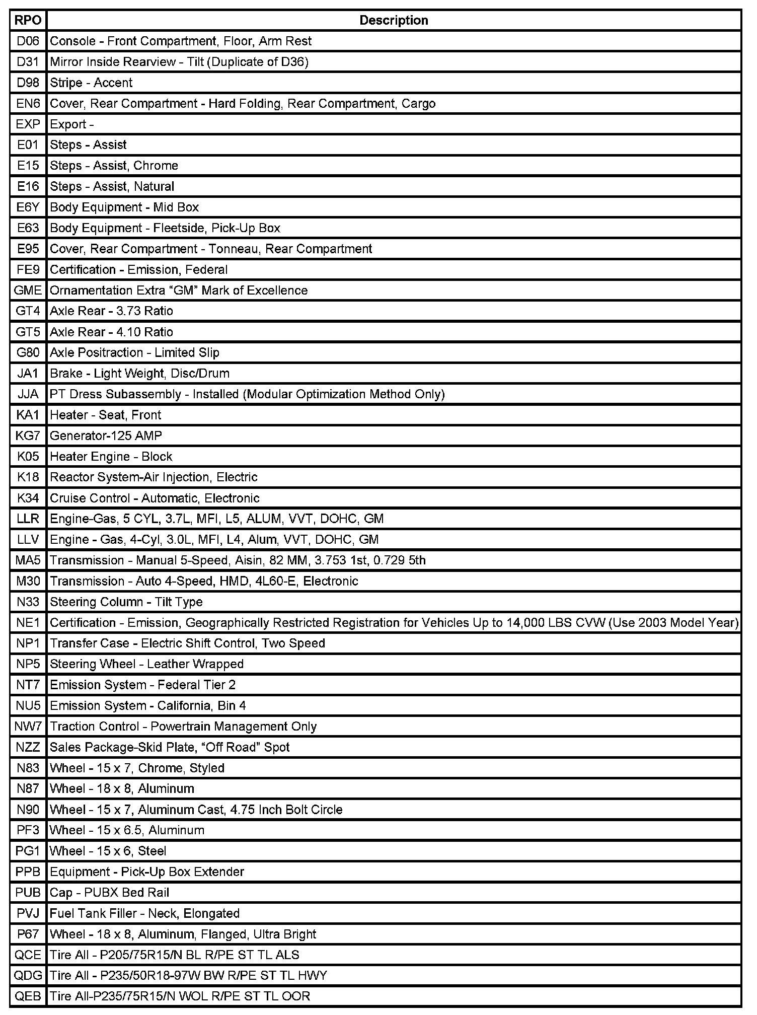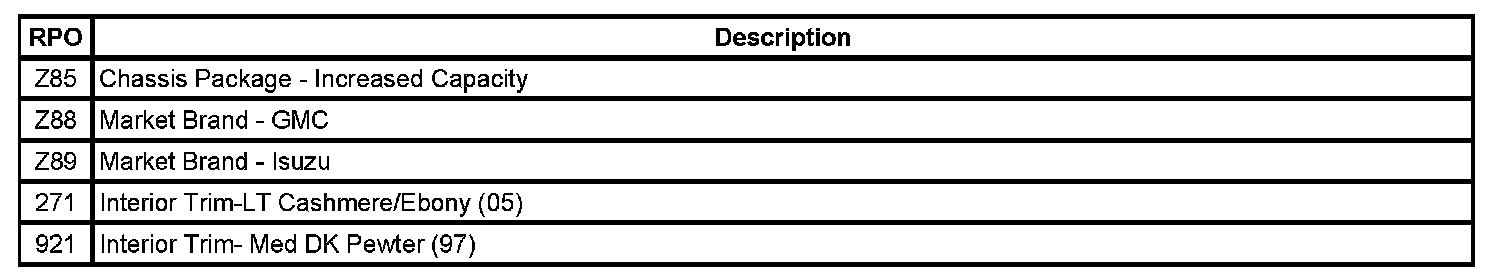 RPO Code List