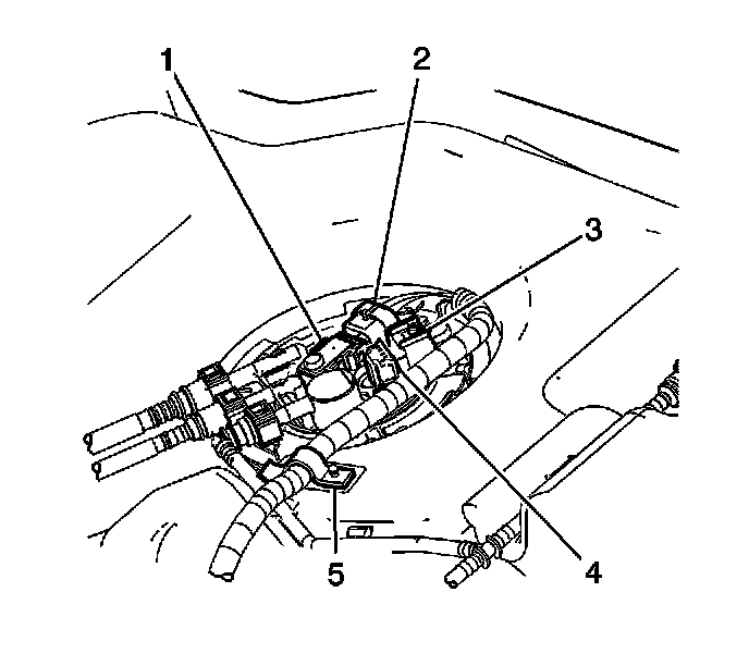 4. Disconnect the chassis wiring harness electrical connector from the fuel tank pressure sensor (1).