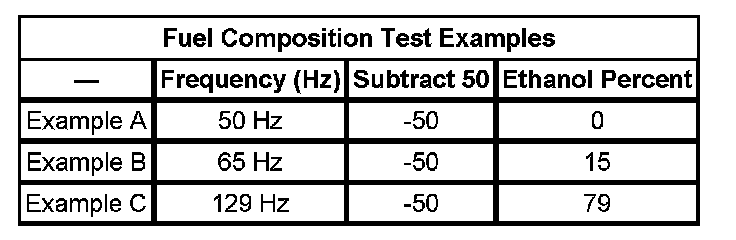 3. Subtract 50 from the reading on the DMM in order to obtain the percentage of alcohol in the fuel sample. Refer to the examples in the Fuel Composition Test Examples table.