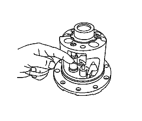 7. Rotate the pinion gears and the pinion thrust washers 90 degrees and align the pinion gears with the pinion shaft opening in the differential case.