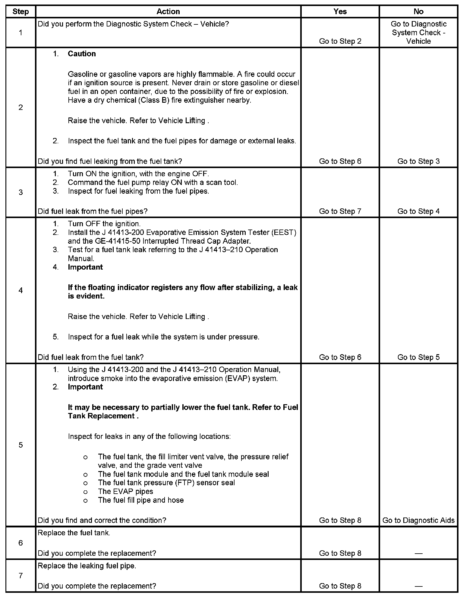 The fuel tank leak test is used to locate any fuel or fuel vapor escaping the fuel tank area. Fuel vapors escaping above the fuel level will be detected, if more than the calibrated amount, when the evaporative emission (EVAP) diagnostics complete one test cycle. The malfunction indicator lamp (MIL) will illuminate after the EVAP diagnostics have failed 2 test cycles.