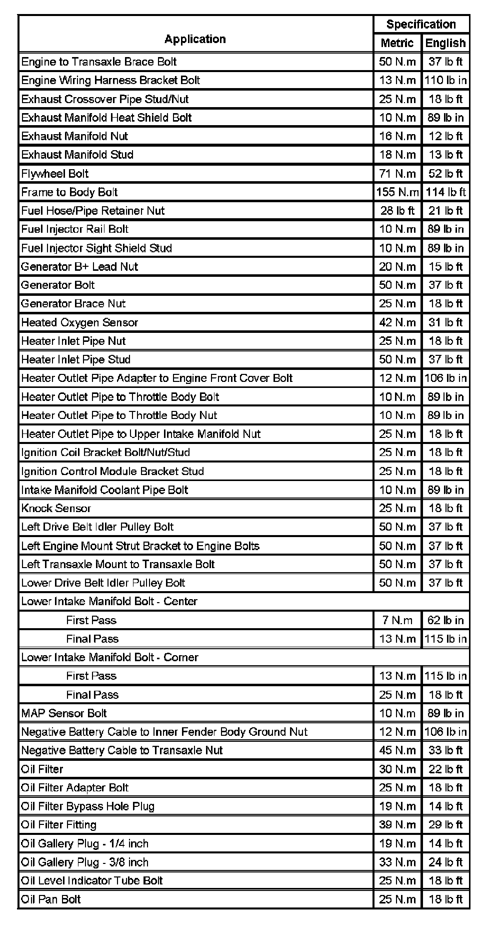 Fastener Tightening Specifications: