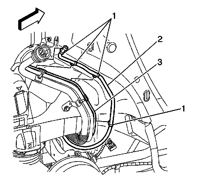 5. Release the retaining clip (2) securing the vent hose along the top of the rear suspension crossmember.