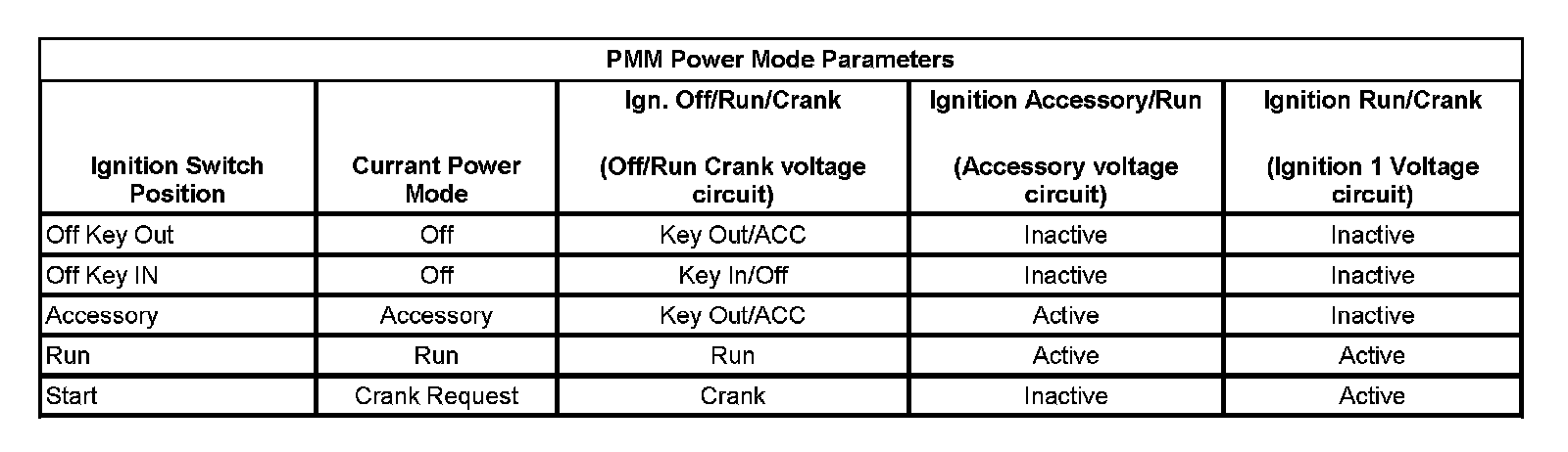 This vehicles power mode master (PMM) is the body control module (BCM). The ignition switch is a low current switch with multiple discrete ignition switch signals to the PMM for determination of the power mode. The PMM receives the ignition switch signals, and additionally a reference voltage signal from the BCM, through the ignition switch, and back to the BCM. There are redundancies within the PMM system that can allow operation of certain subsystems when there are faults in the ignition switch circuits. Other information such as serial data input from other modules and DTCs is also used to determine what power mode signals and information is transmitted by the PMM. The BCM logic uses all this information to identify the operators desired power mode and activate specific discrete signals, and serial data messages for the operation of many different subsystems as necessary. Other modules which have switched voltage inputs may operate in a default mode if the PMM serial data message does not match what the individual module can see from its own connections.