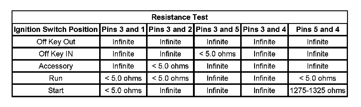 Using the Resistance Test below, check the resistance between the pins of the ignition switch listed in each switch position listed.
