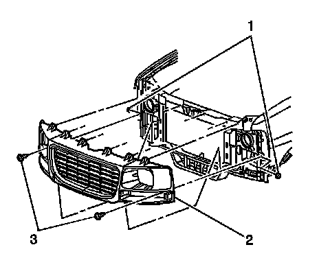2. Remove the bolts (2) that retain the radiator grille (1) to the radiator support.