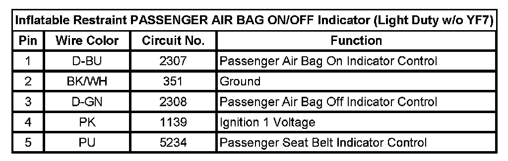 Inflatable Restraint PASSENGER AIR BAG ON/OFF Indicator (Light Duty w/o YF7)