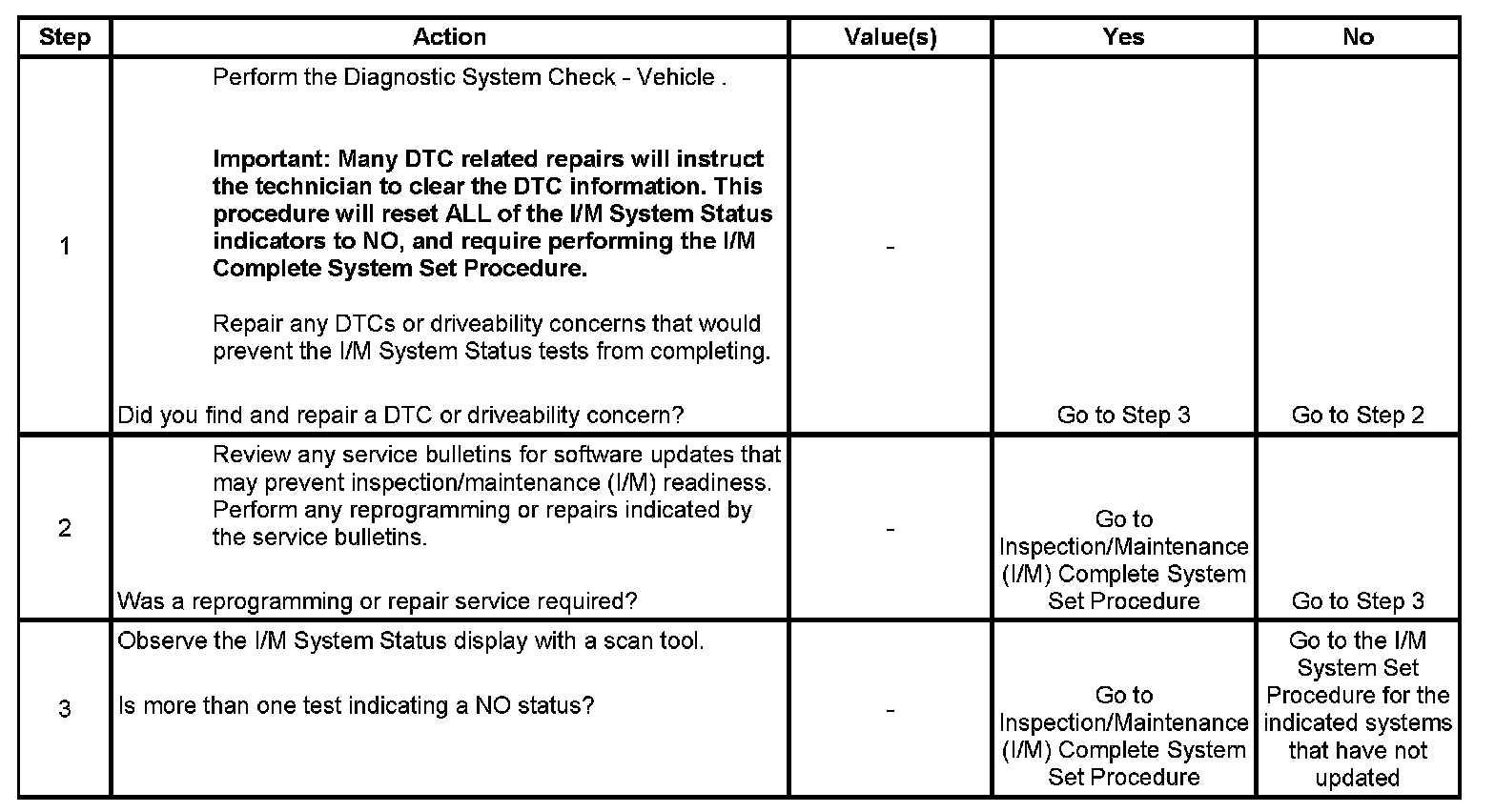 For the specific DTCs required for each system, Refer to Inspection/Maintenance (I/M) System DTC Table. Systems such as fuel delivery, misfire, and comprehensive components may not be listed in a system status list. These tests run continuously and do not require an I/M System Status indicator. Inspection/Maintenance (I/M) System DTC Table