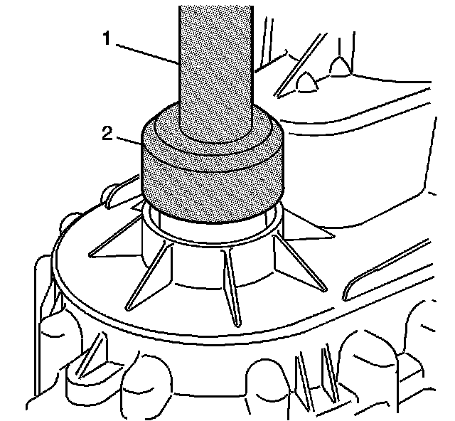 9. If removed, install the input shaft rear support bearing in the rear output shaft using J 42176 (1) and J 45848 (2).