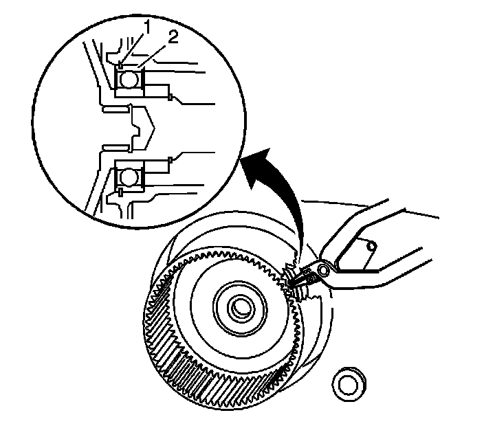 16. Ensure the retaining ring (1) is installed in the groove of the rear output shaft bearing (2).