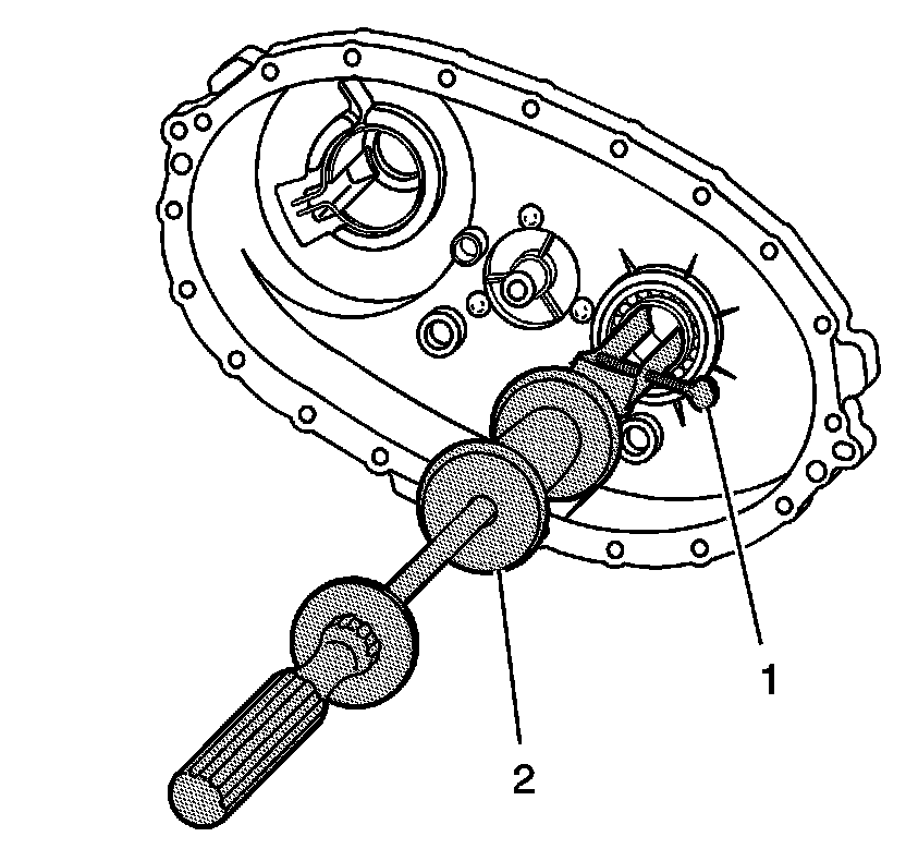 40. Remove the rear bearing for the front output shaft from the rear case, using the J 26941 (1) and the J 23907 (2).