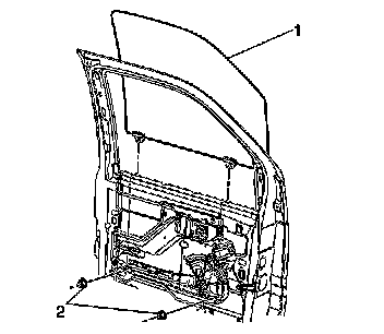 9. Remove the nuts (2) that retain the front door window (1) to the sash.