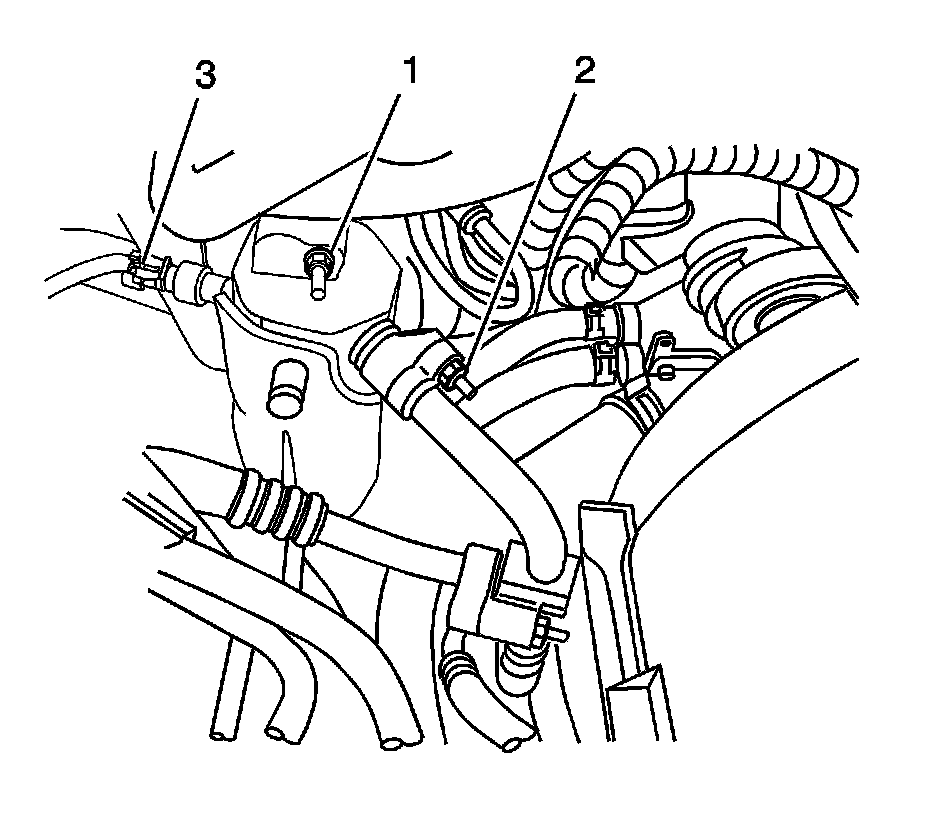 4. Remove the evaporator outlet hose retaining nut (3) from the accumulator.