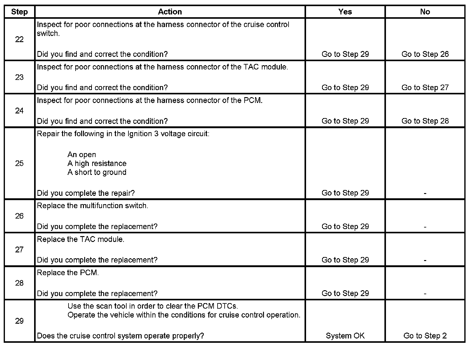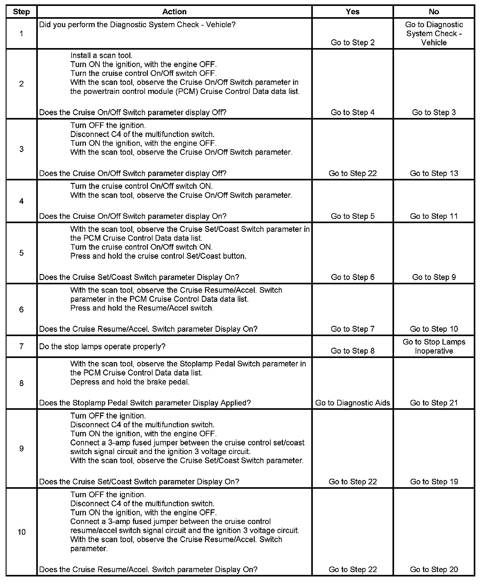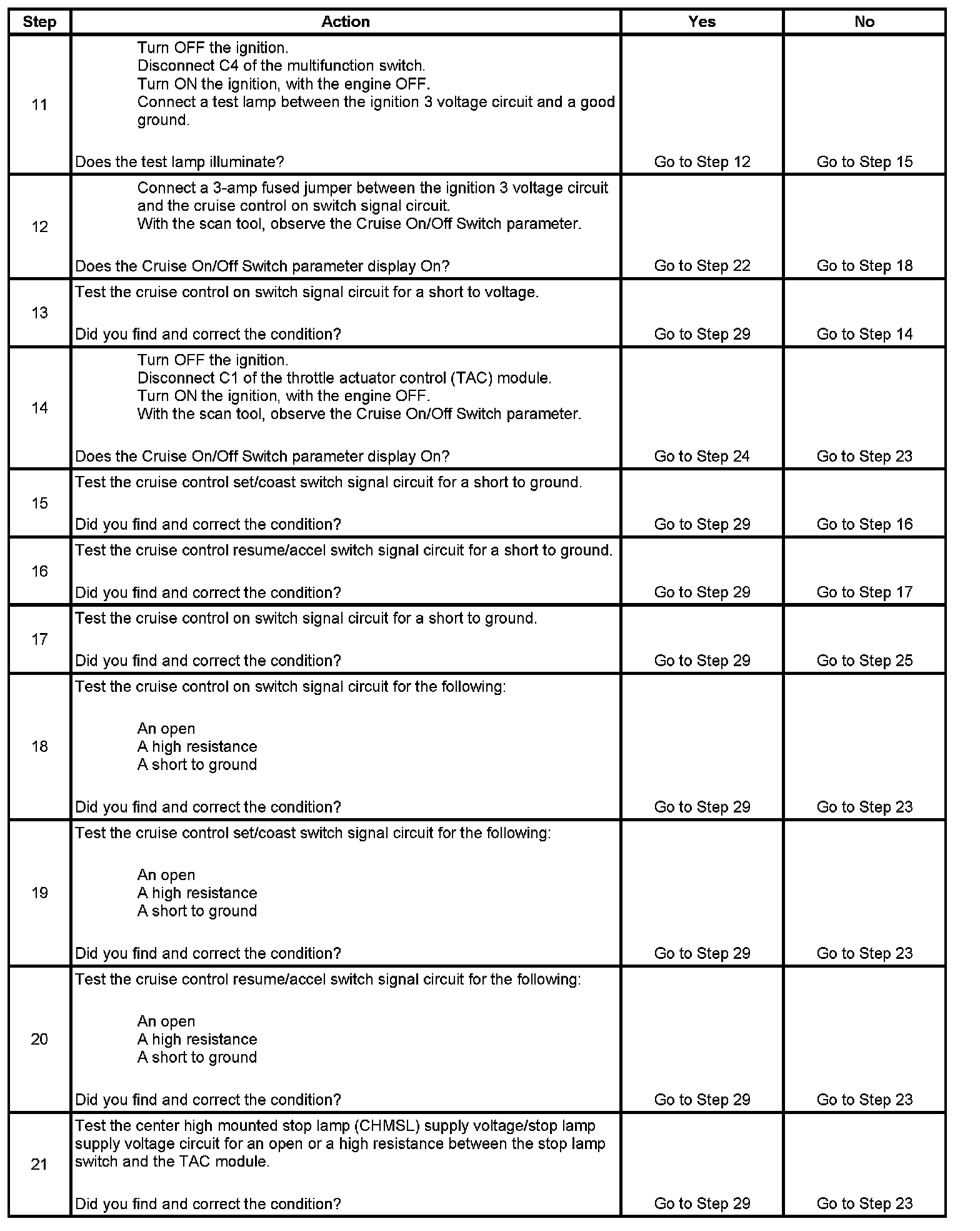 10. This step tests the cruise control resume/accel switch signal circuit for an open or for a high resistance.