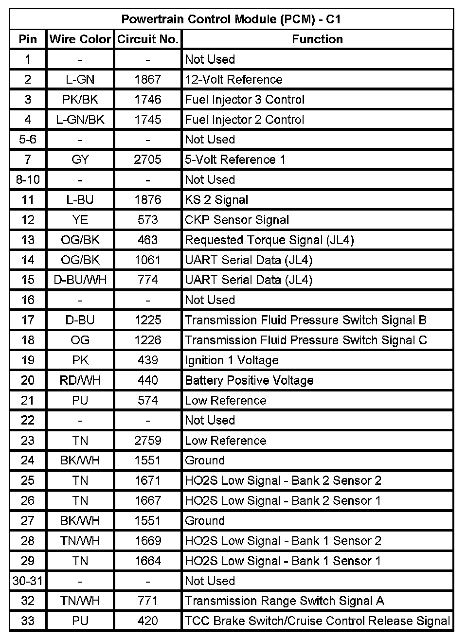 Powertrain Control Module (PCM) - C1 (Pin 1 To 33):
