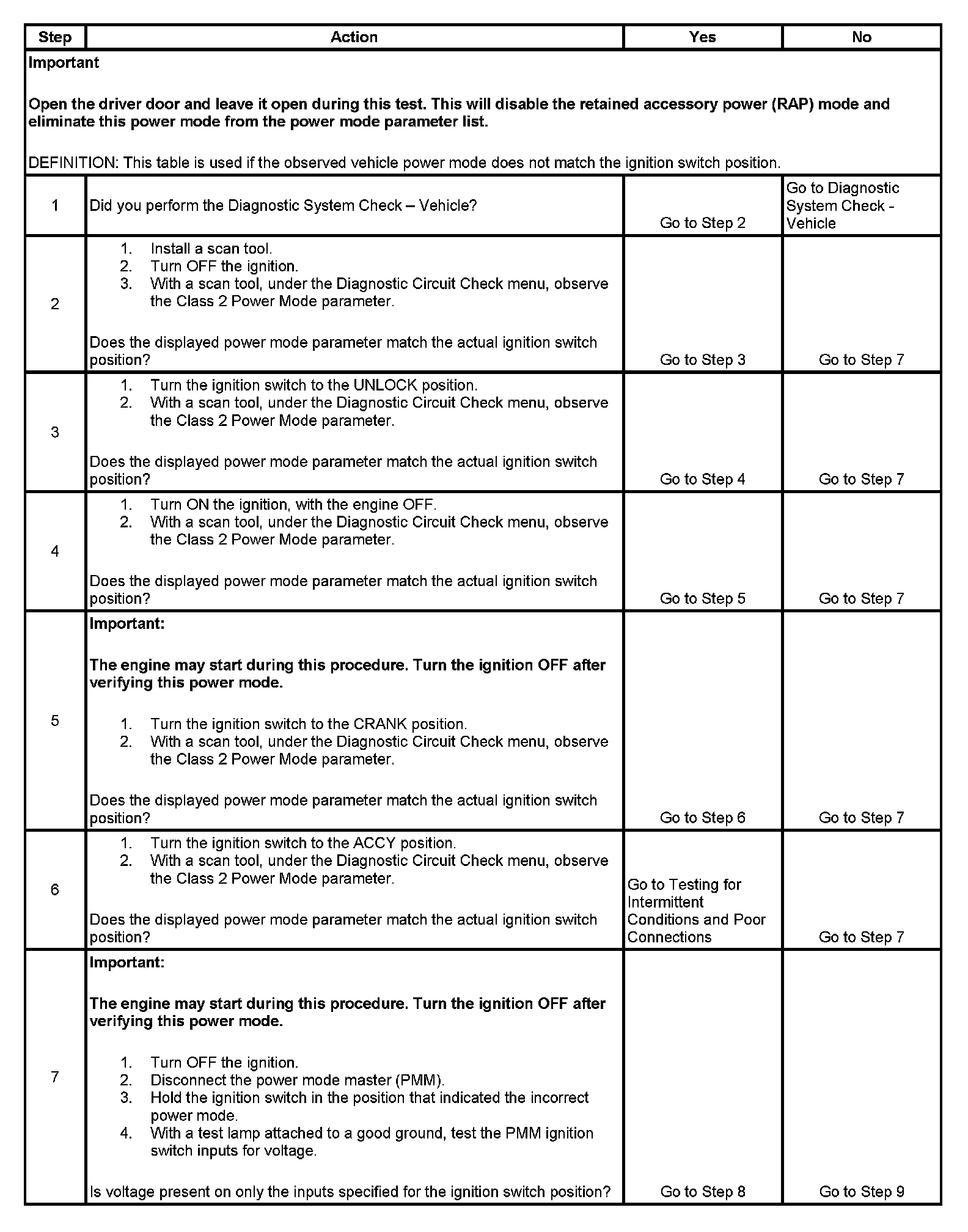 The numbers below refer to the step numbers on the diagnostic table.