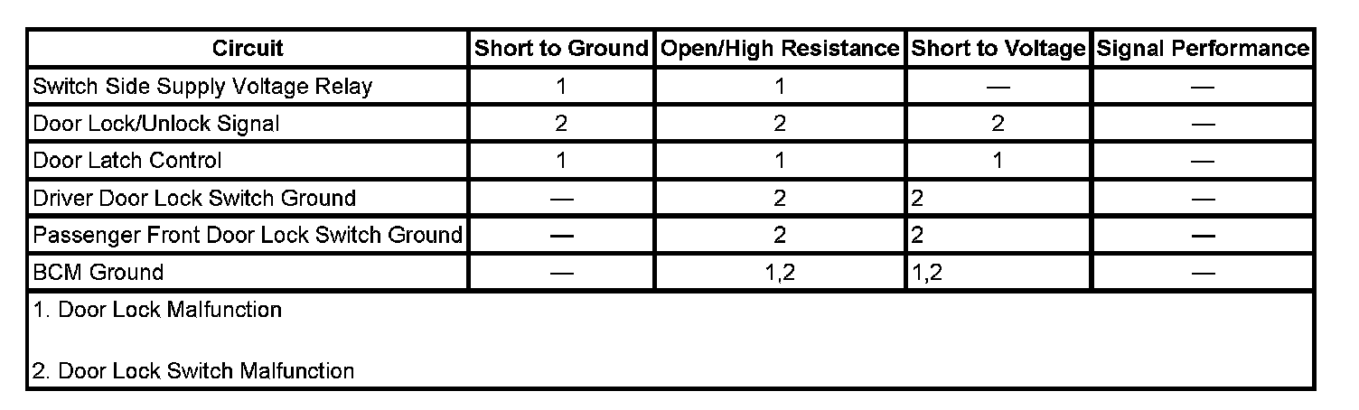 - If the door does not Lock and Unlock when changing between commanded states, refer to Door Lock Malfunction.