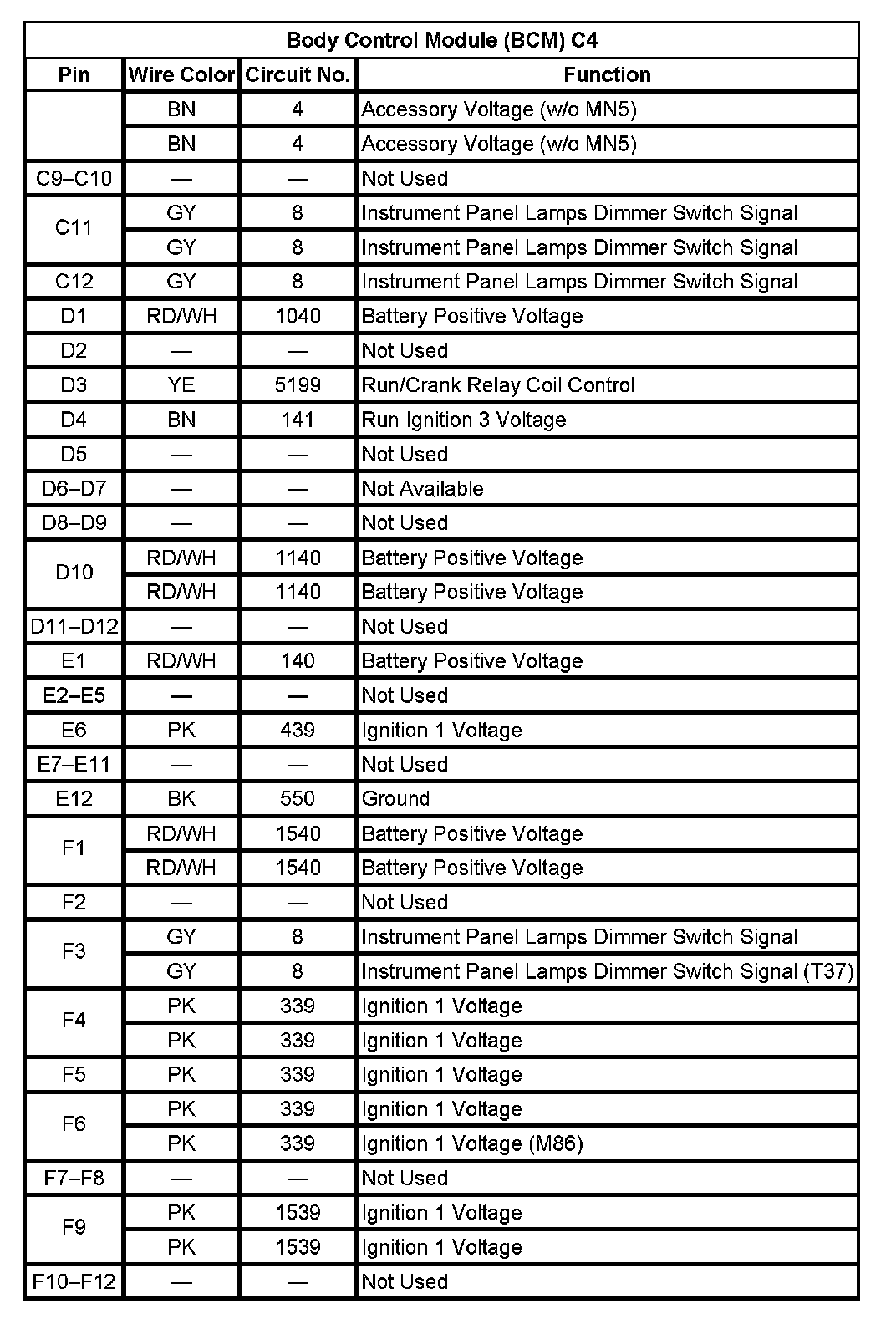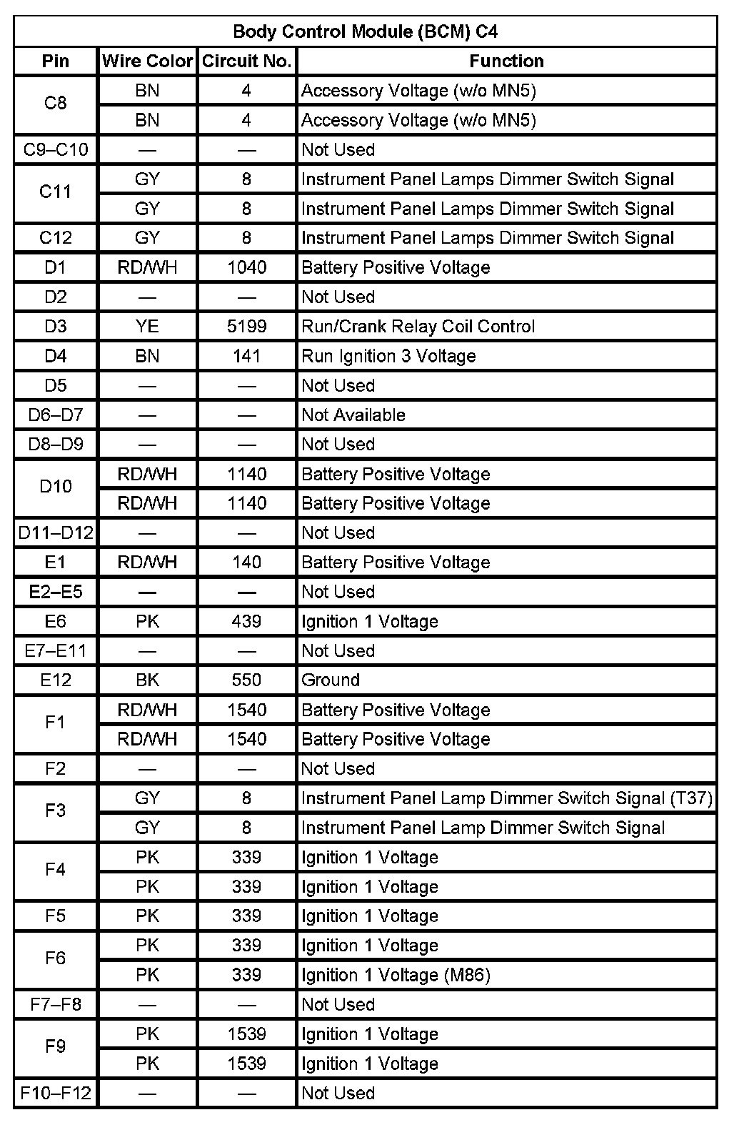 Body Control Module (BCM) C4 (Pin C9 To F12):
