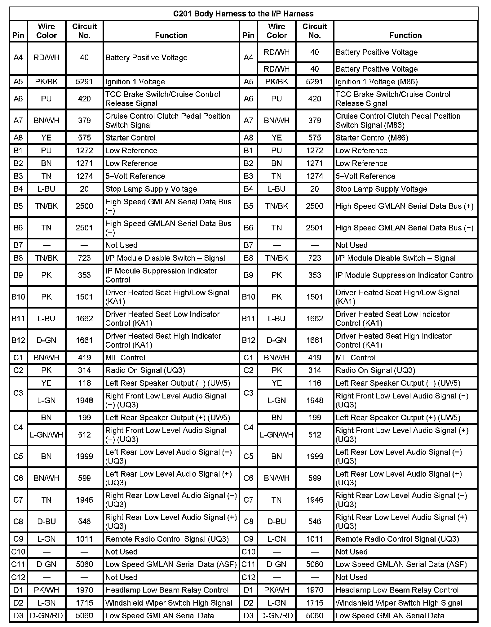 C201 Body Harness To The I/P Harness (Pin A4 To D3):
