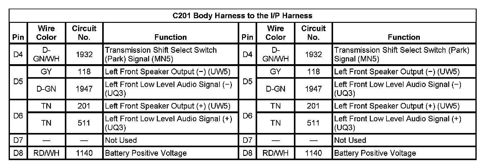C201 Body Harness To The I/P Harness (Pin D4 To D8):