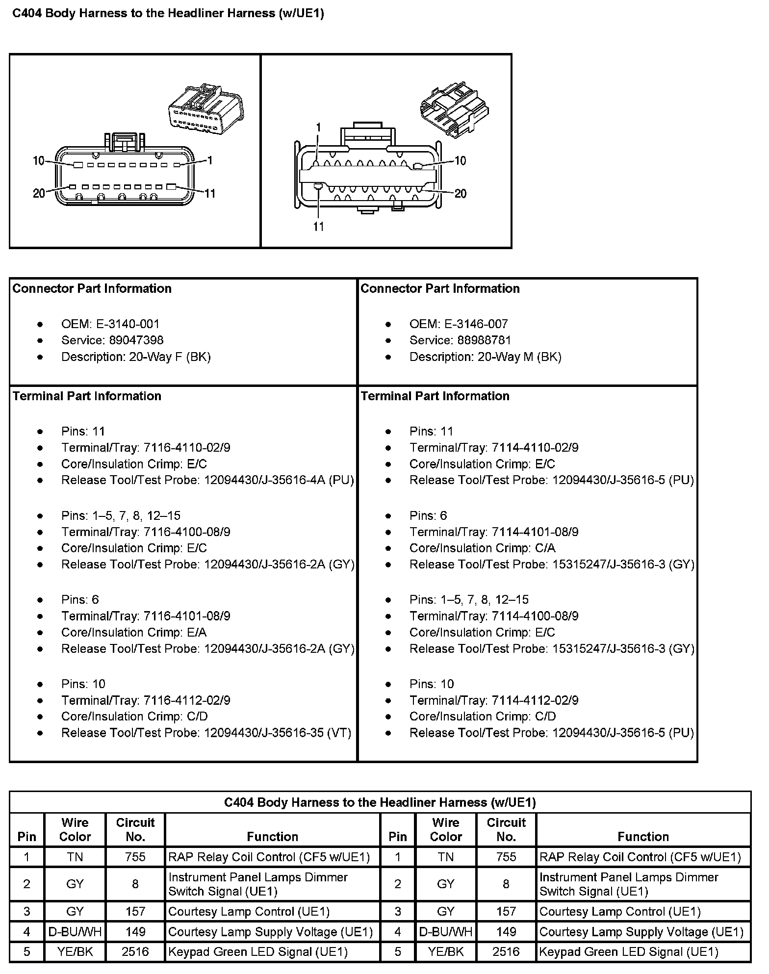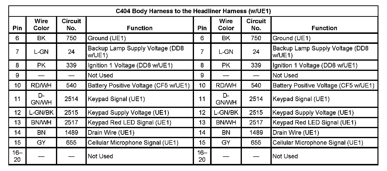 C404 Body Harness To The Headliner Harness (With RPO Code UE1) (Pin 6 To 20):