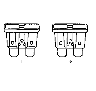 The fuse is the most common method of an automotive wiring circuit protection. Whenever there is an excessive amount of current flowing through a circuit the fusible element will melt and create an open or incomplete circuit. Fuses are an one time protection device and must be replaced each time the circuit is overloaded. To determine if a fuse is open, remove the suspected fuse and examine the element in the fuse for an open (2). If not broken (1), also check for continuity using a DMM or a continuity tester. If the element is open or continuity is suspect, replace the fuse with one of equal current rating.