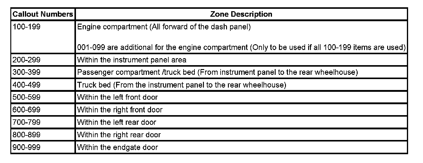 All grounds, in-line connectors, pass-through grommets, and splices have identifying numbers that corresponds to where they are located in the vehicle. The table explains the numbering system.