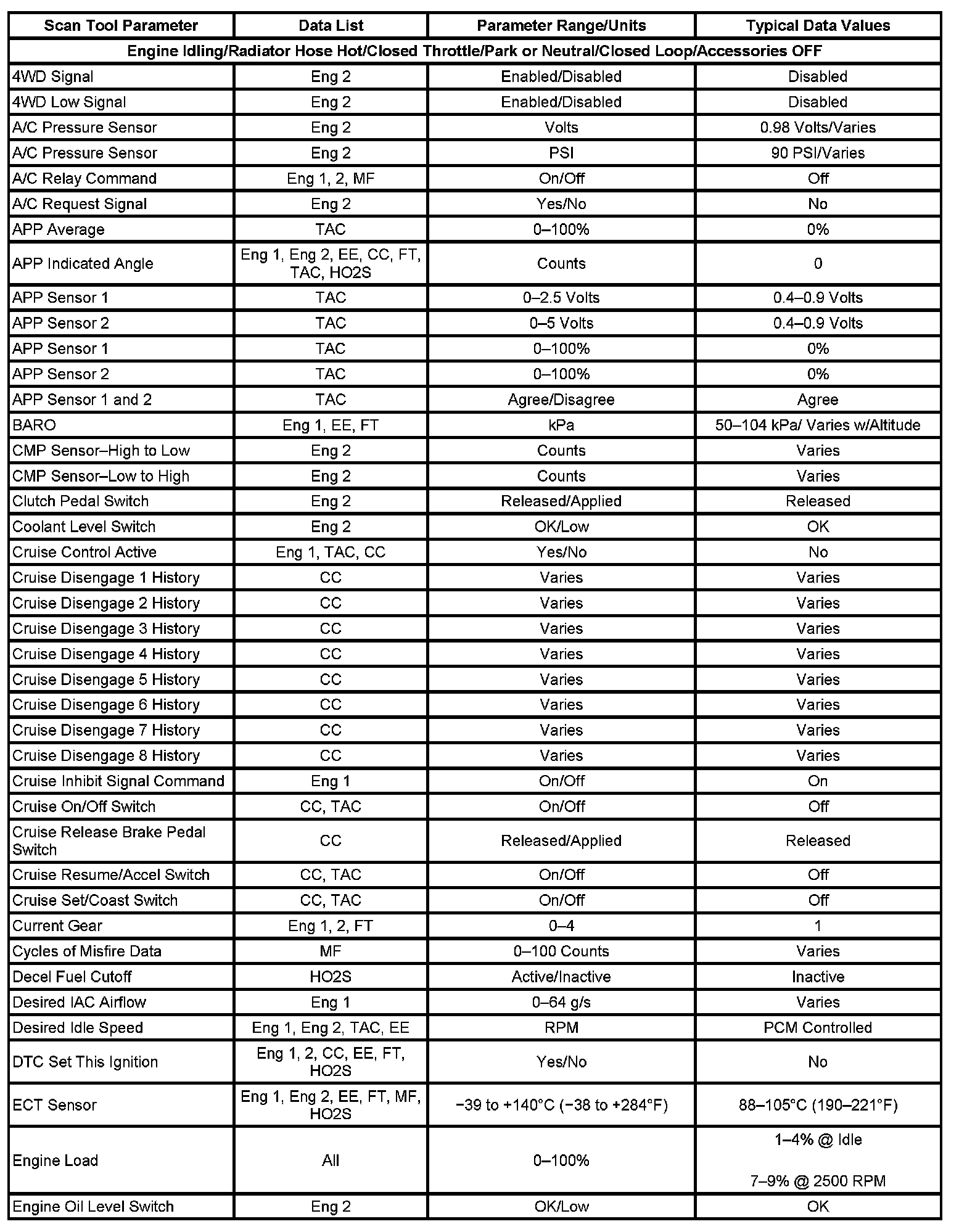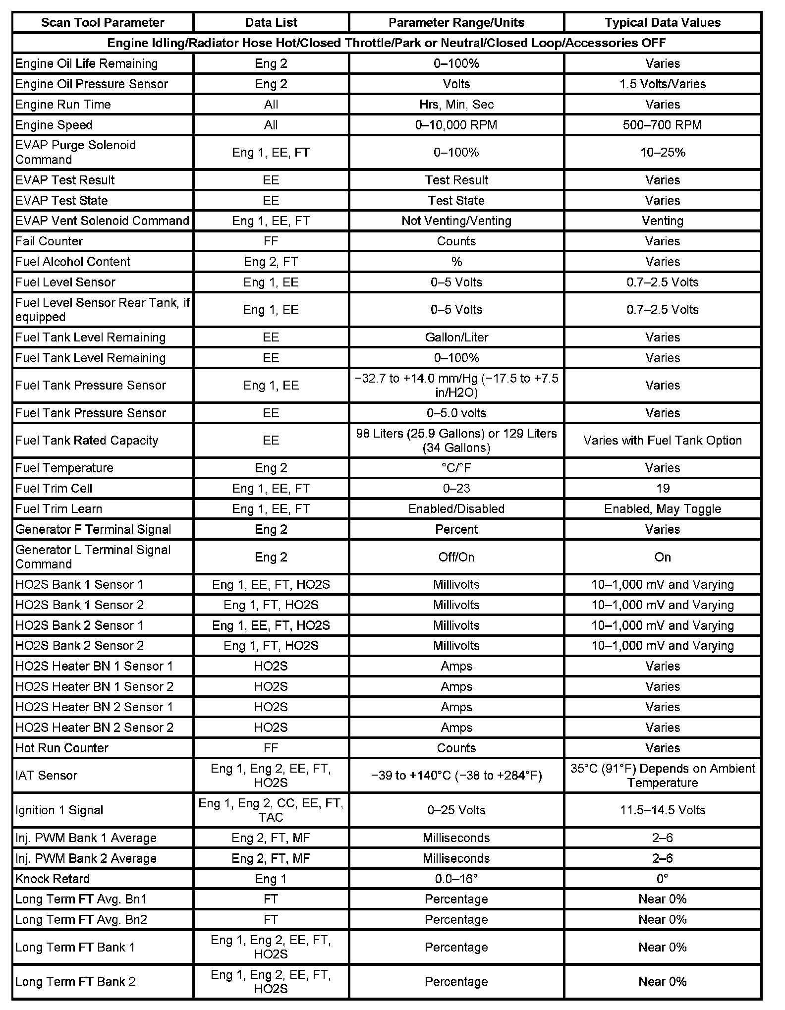The Engine Scan Tool Data List contains all engine related parameters that are available on the scan tool. The list is arranged in alphabetical order. A given parameter may appear in any one of the data lists, and in some cases may appear more than once, or in more than one data list in order to group certain related parameters together.