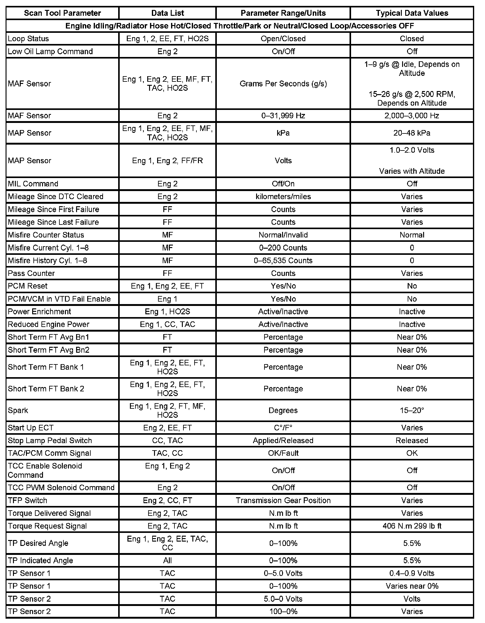 The column labeled Data List indicates where a parameter can be located on the scan tool. Refer to the scan tool operating manual for the exact locations of the data lists. The following is a description of each term listed: