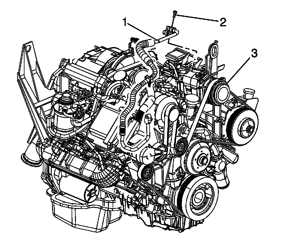 6. Remove the discharge hose bolt (2) from the A/C compressor (3).