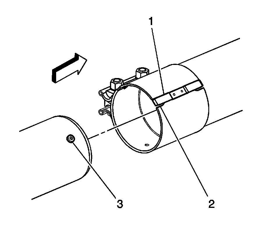 11. Gently pry up the catalytic converter coupling clip (1) (on the muffler end) in order to disengage the locator button (3) from the coupling clip.