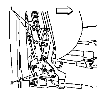 4. Remove the bolts (1,2) that retain the latch assembly to the seat frame.