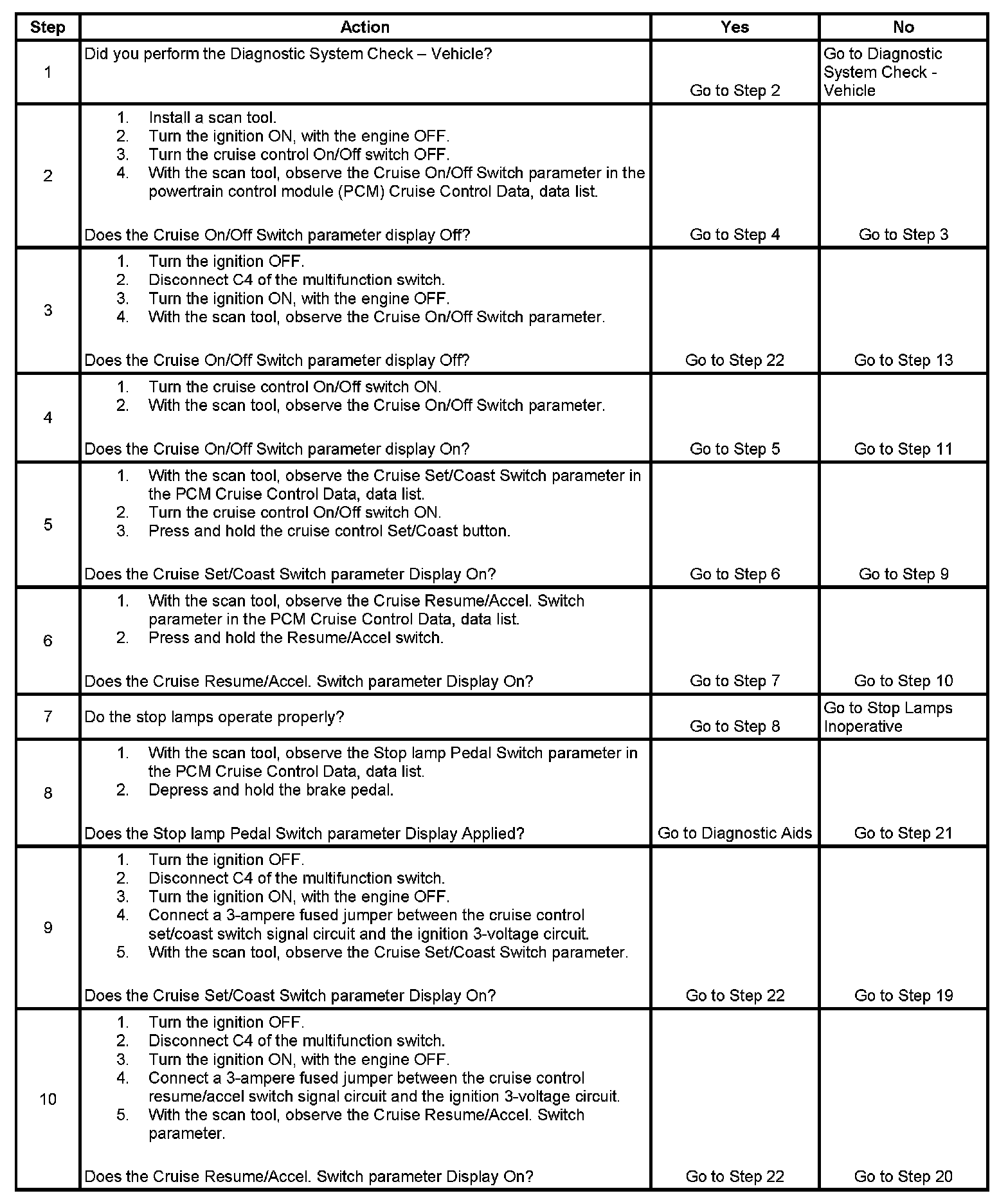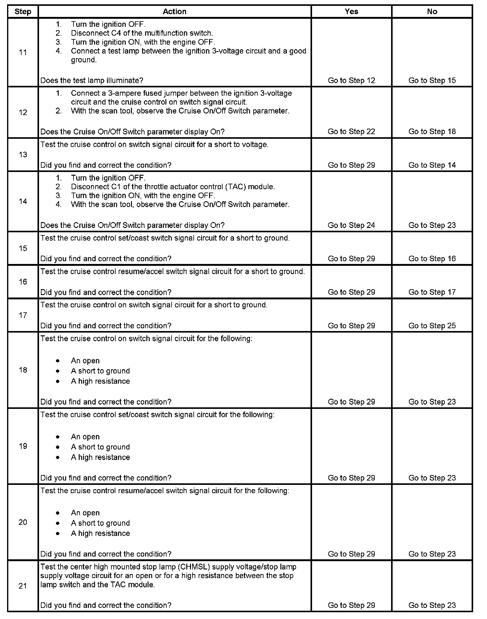10. This step tests the cruise control resume/accel switch signal circuit for an open or for a high resistance.