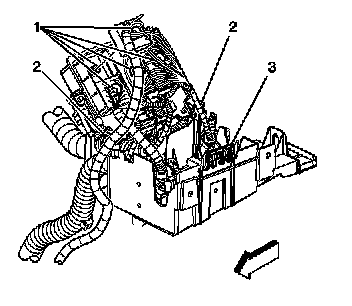 9. To replace the engine electrical center bracket remove the 4 retaining bolts (1).