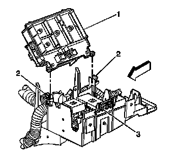 3. Align the electrical center block (1) stubs in the slots so that the tabs (2) retains it in place.