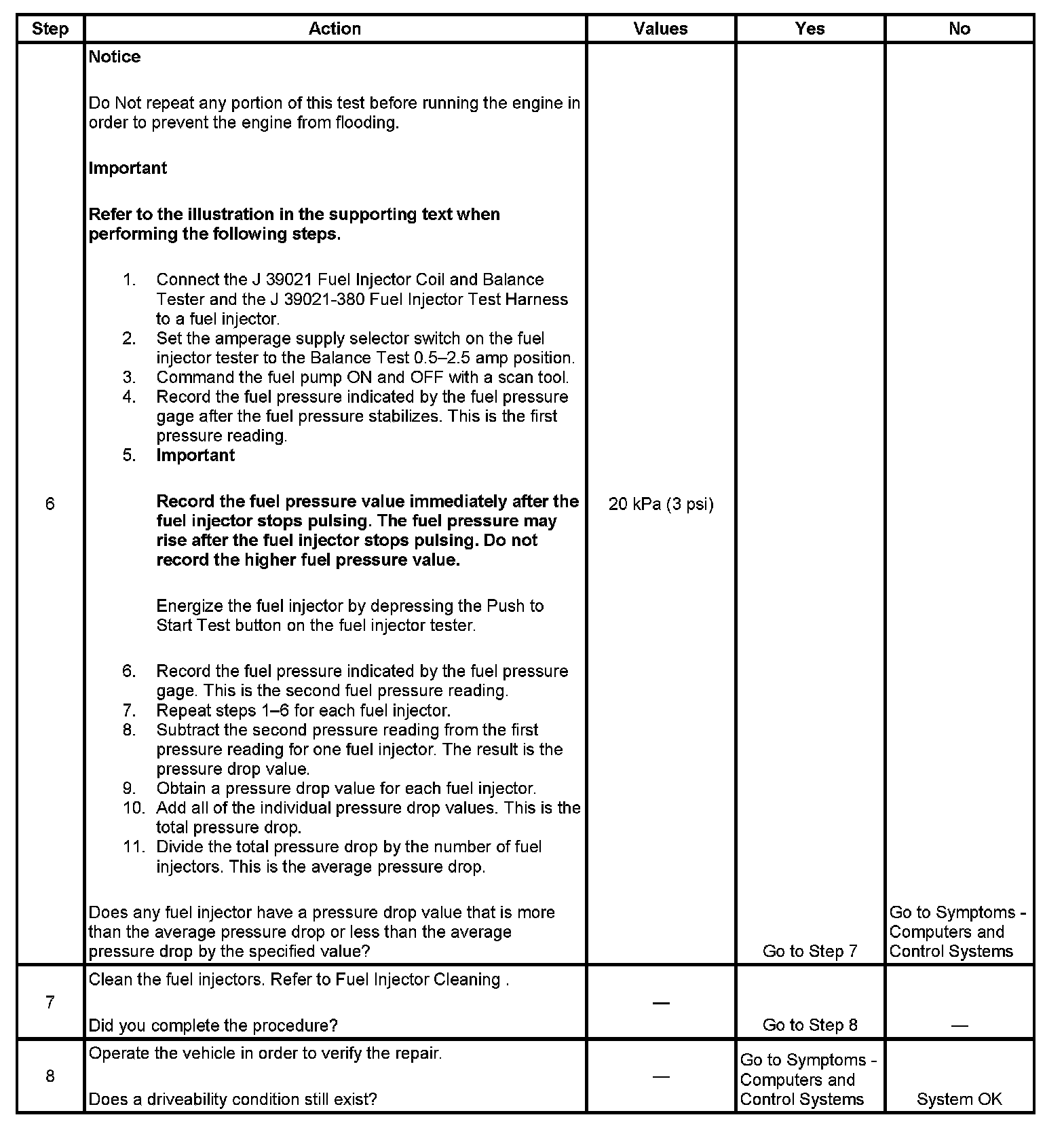 6. If the pressure drop value for each fuel injector is within 10 kPa (1.5 psi) of the average pressure drop value, the fuel injectors are flowing properly. Calculate the pressure drop value for each fuel injector by subtracting the second pressure reading from the first pressure reading. Refer to the illustration.