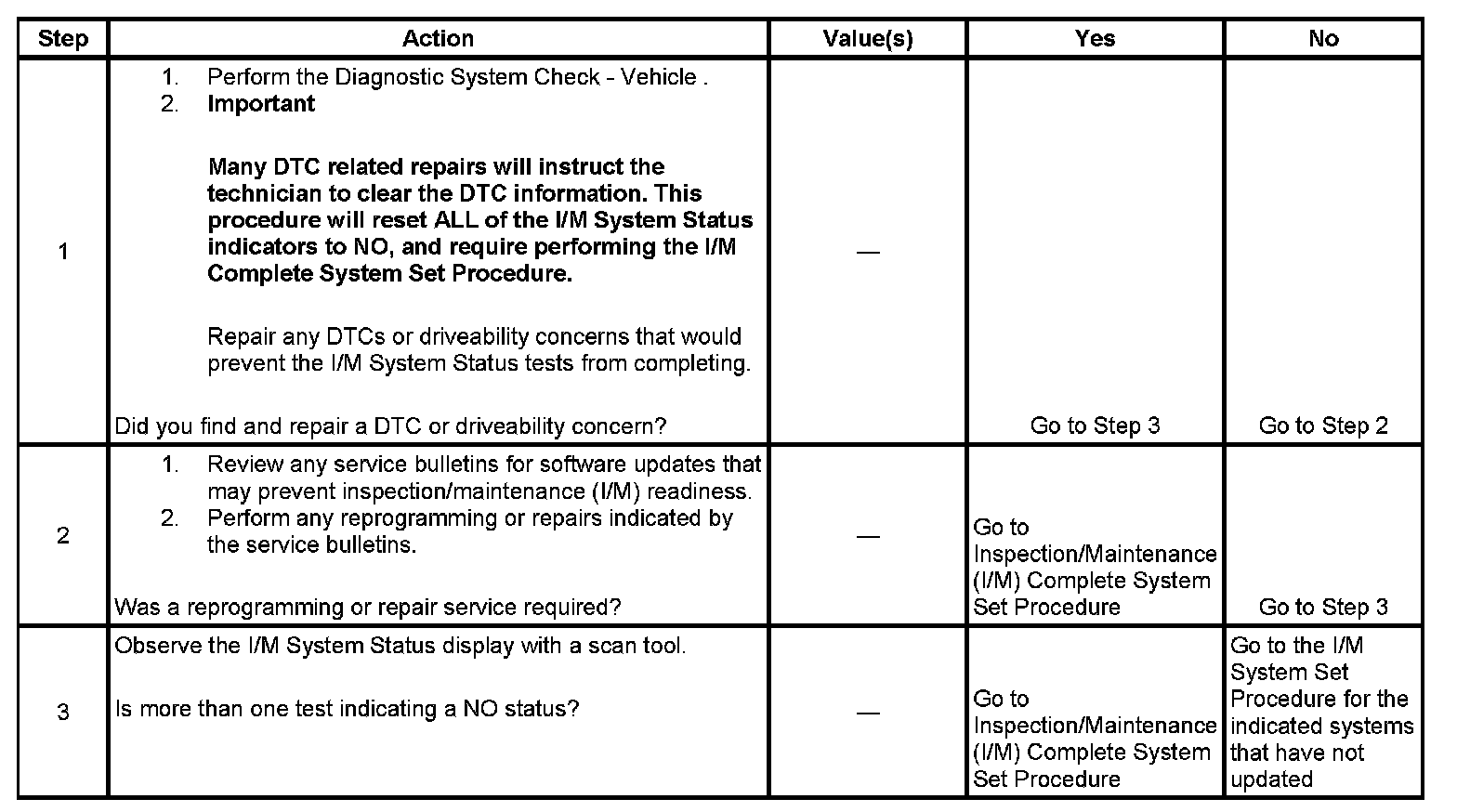 For example, when the HO2S Heater Status indicates YES, either all of the oxygen sensor heater tests have passed or one of the tests has illuminated the MIL. If the vehicle has four heated oxygen sensors, either all four heater circuit tests have passed or one of the heater circuit tests has illuminated the MIL. The I/M System Status will indicate NO under the Completed column when any of the required tests for that system have not run. The following is a list of conditions that would set the I/M System Status indicator to NO: