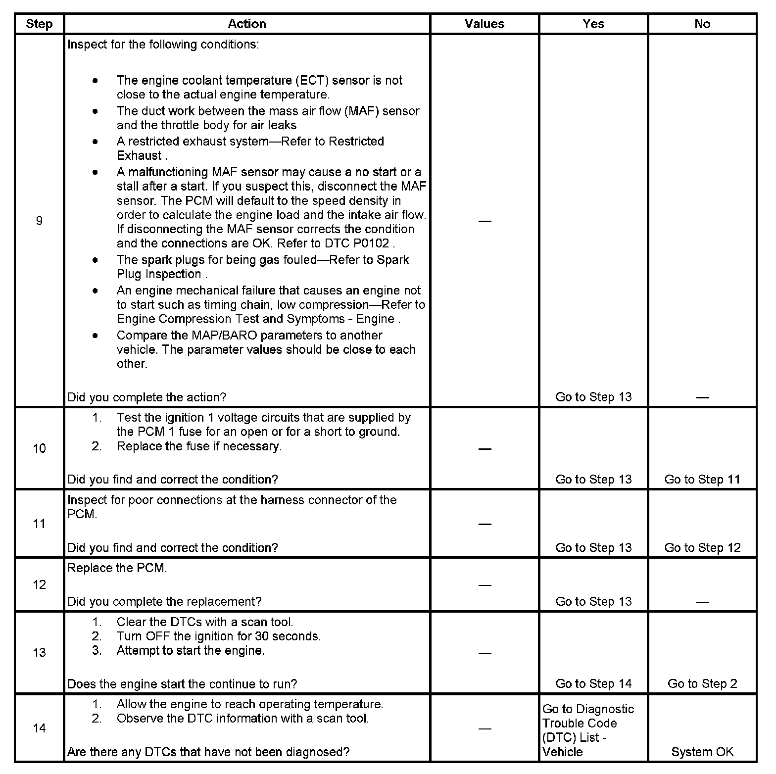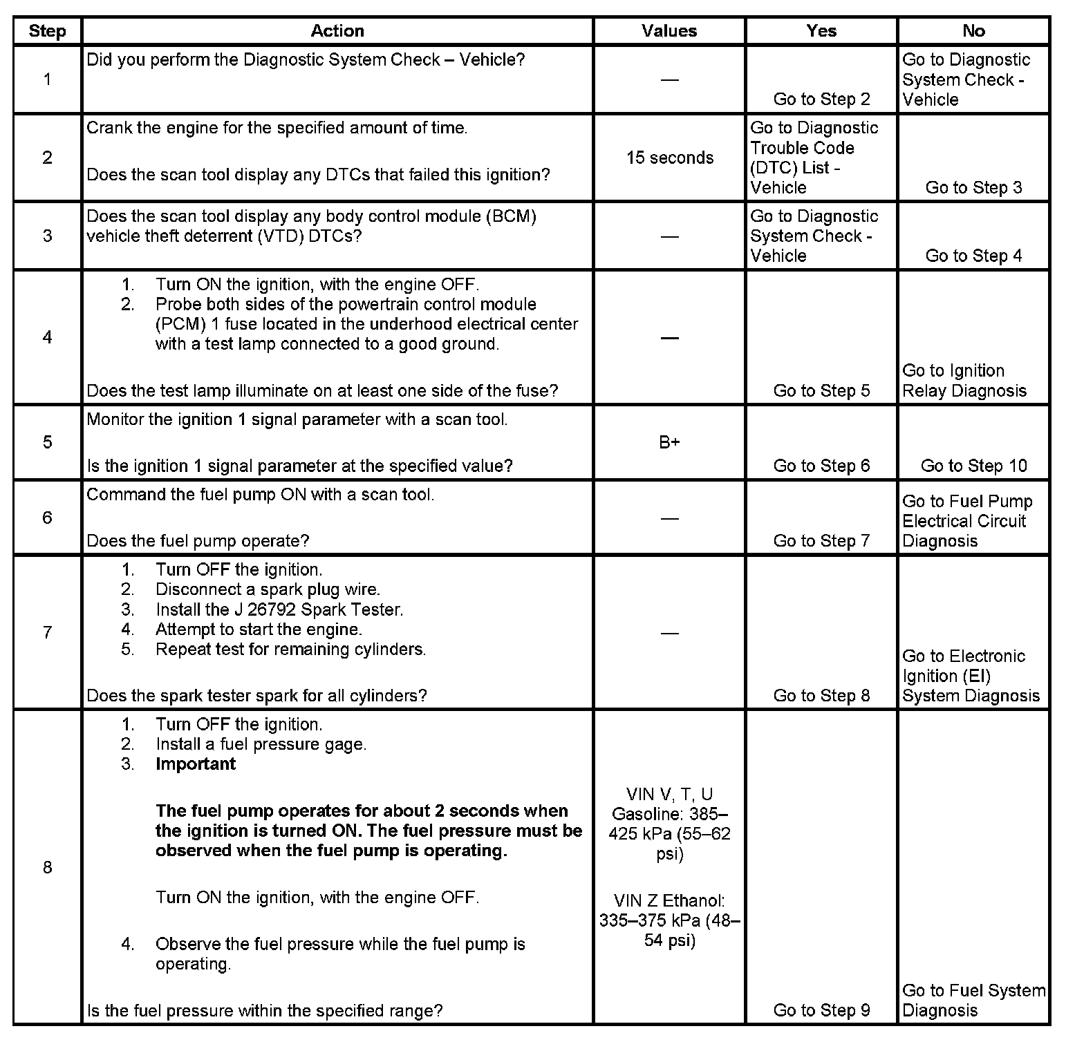 The Engine Cranks but Does Not Run diagnostic table is an organized approach to identifying a condition that causes an engine to not start. The diagnostic table directs the service technician to the appropriate system diagnosis. The diagnostic table assumes the following conditions are met: