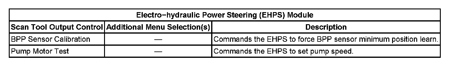 Use the scan tool Special Functions in order to perform certain tests and functions in the electro-hydraulic power steering (EHPS) system. The CANdi module needs to be attached to the scan tool. The table below lists the tests and functions that are available for the EHPS system. The tests and functions are listed in alphabetical order.