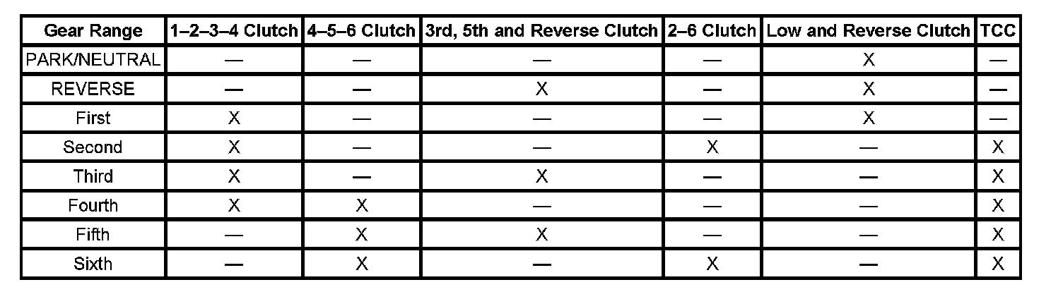 The Allison 1000 Series transmission consists of 5 clutches. A combination of 2 clutches is required to be engaged, in order to attain a torque path from the input to the output of the transmission. The following table indicates the clutch combinations for each gear range.