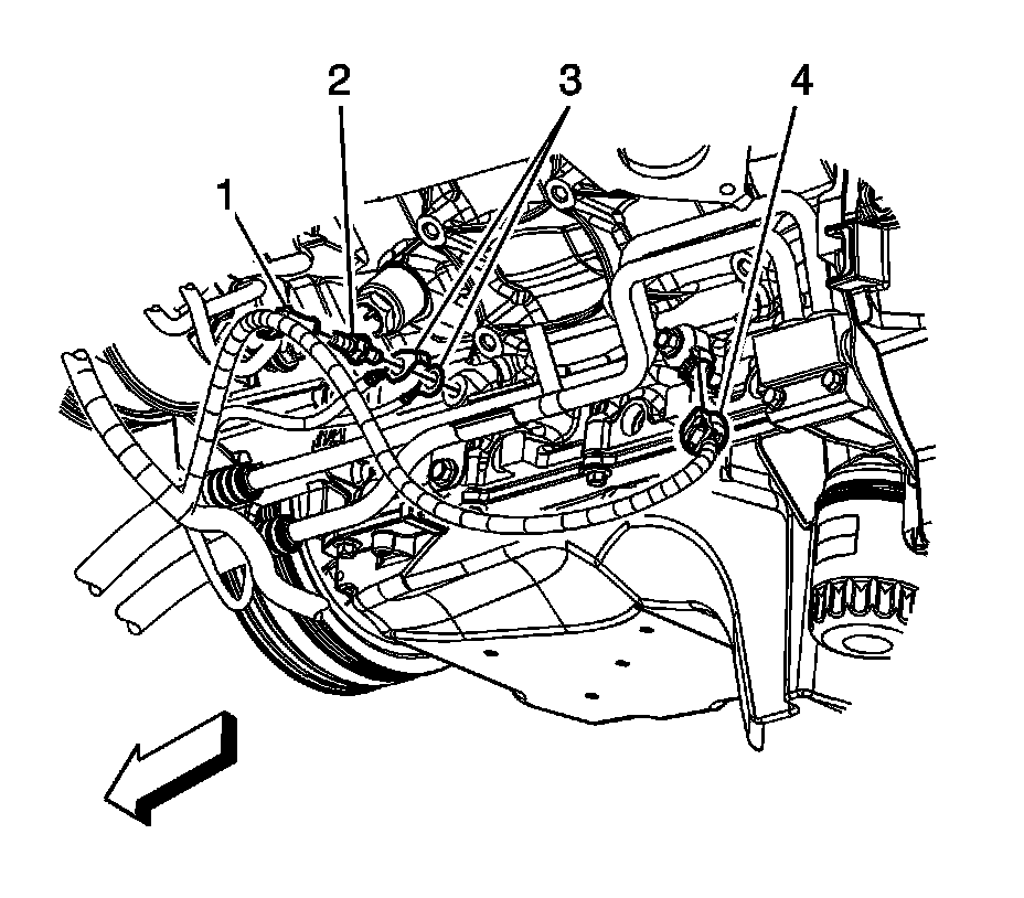 2. Working through the wheel well opening, disconnect the engine wiring harness electrical connector (4) from knock sensor.